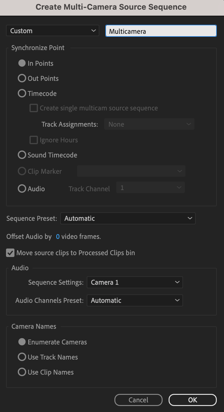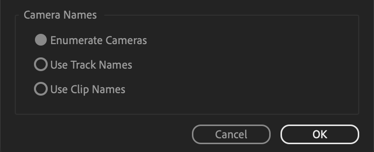 - Opens Opens - Create Multi-Camera Source Sequence dialogue box. You can give it a name here.