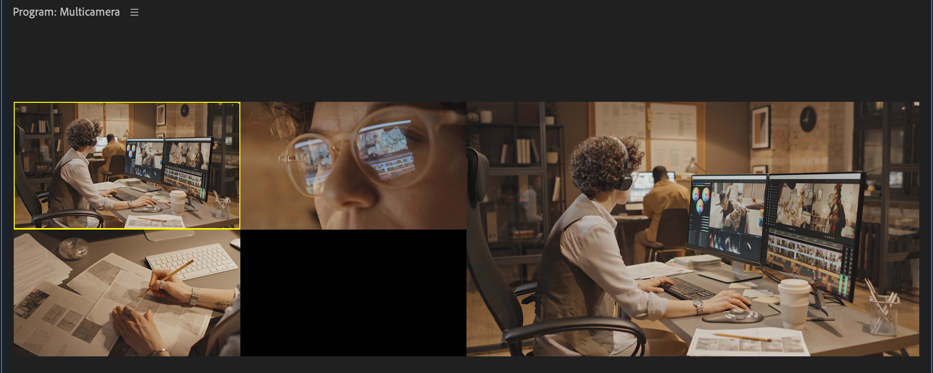 - The Preview Monitor will split into two, Left side shows all your different Camera angles and the right an Output of your edit.
